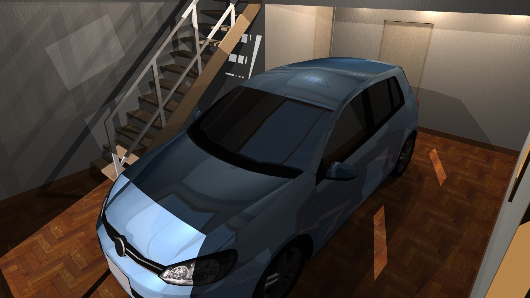 太陽光が室内に綺麗に差込み、フローリング、ソファなどの素材感がレイトレースレンダリングより優れています。ガラスへの映り込みも自然です。