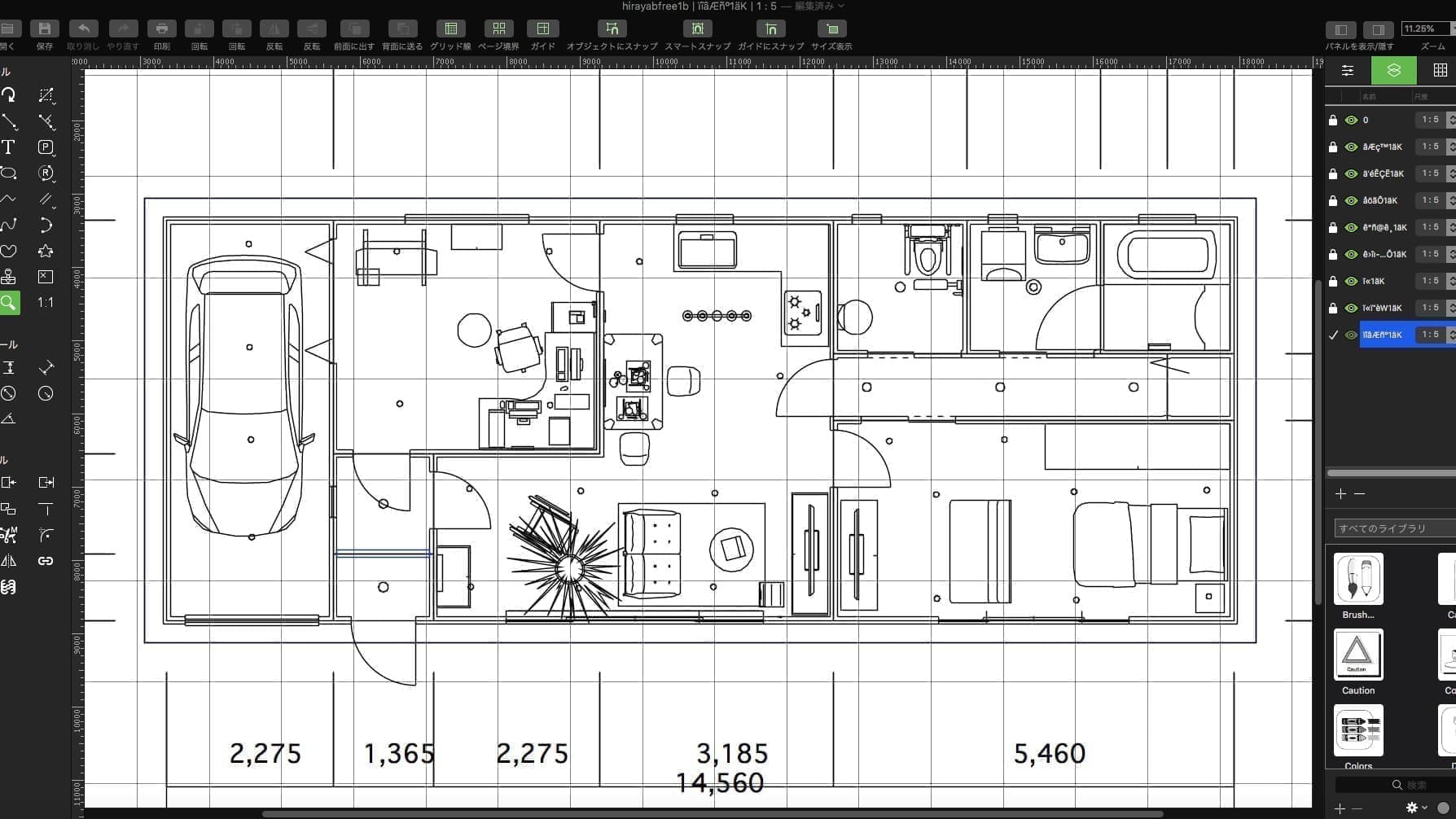 左図 3DマイホームデザイナーPROよりDXF出力したファイルをDrafting CAD PRO Macにて編集した図。