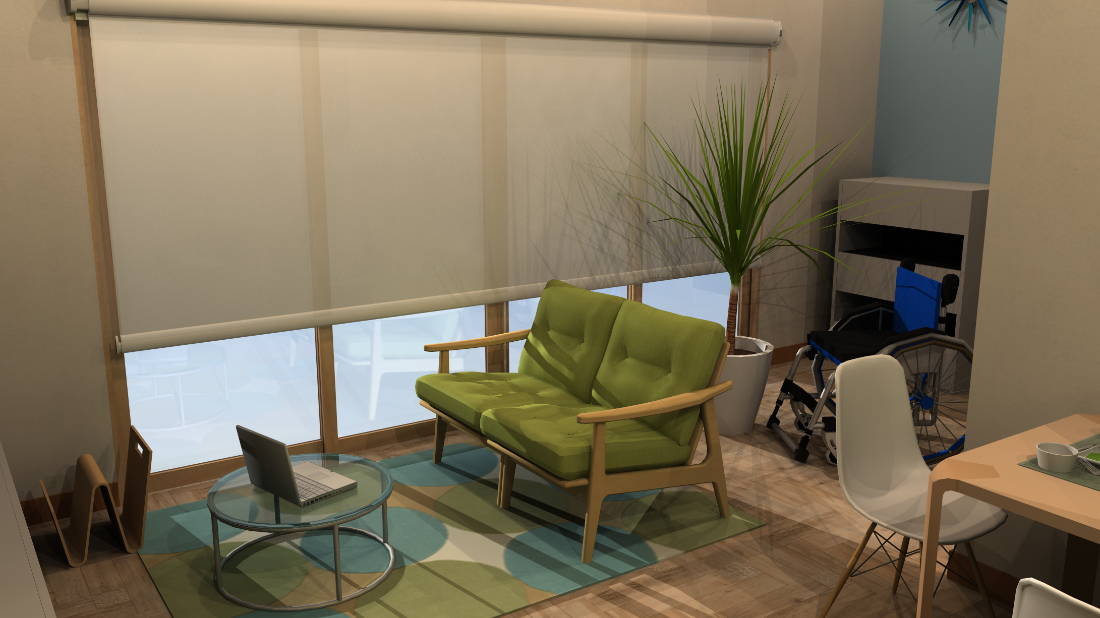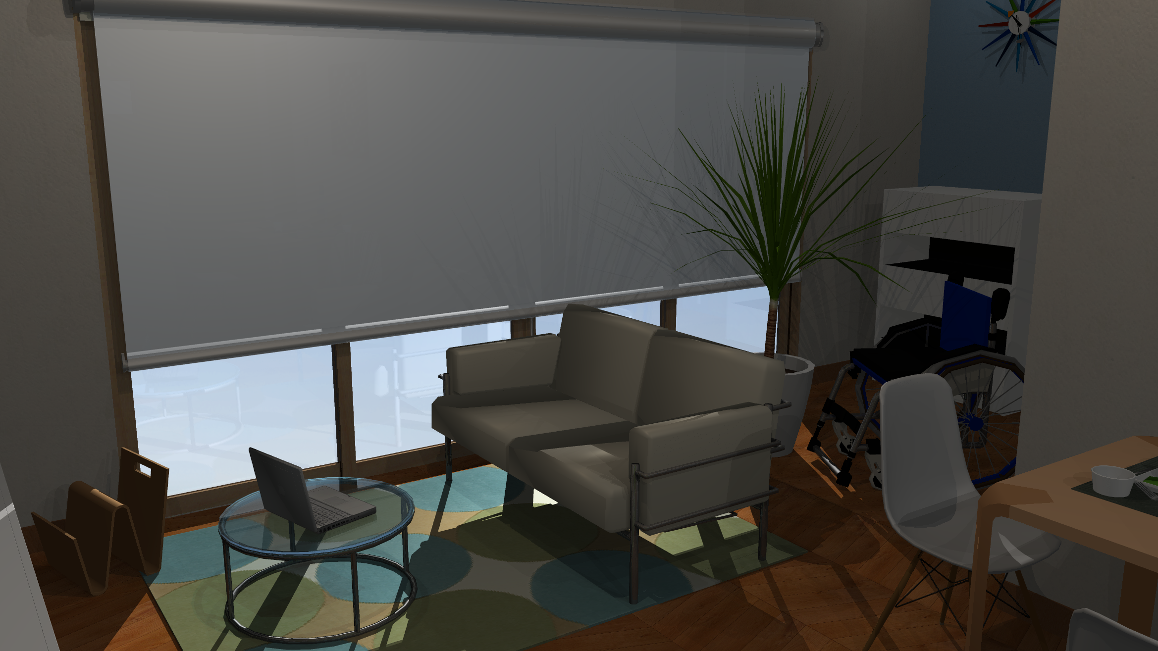 ロールスクリーンの太陽光の透過具合やソファ、チェアの素材感でOptimageにやや及ばないが、フローリングに差込む太陽光やエレメントの影は綺麗に出ています。